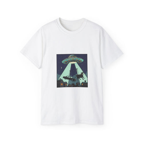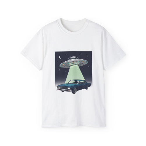 Alien Abduction Car T-Shirt — UFO Night Graphic Tee Adult Unisex